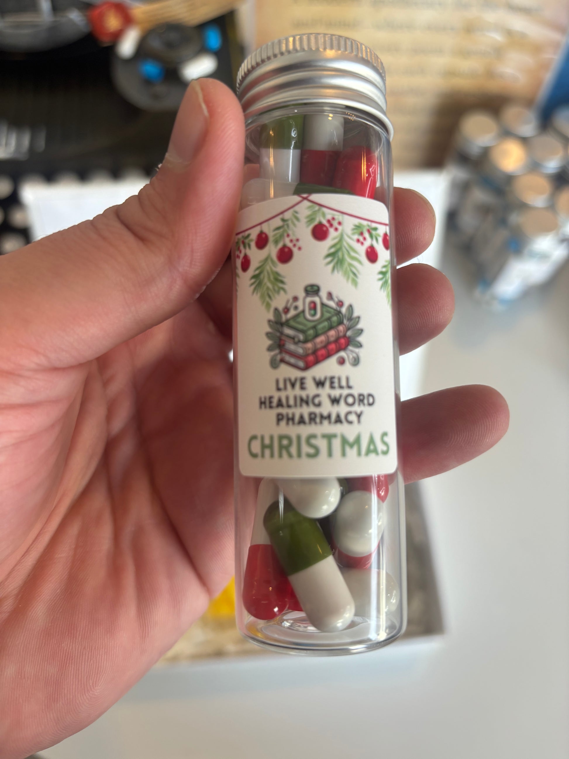 A beautifully carved-out book conceals four glass vials filled with “prescription” capsules — each one holding a tiny scroll of poetry meant to soothe the soul. From love notes to gentle reminders, every capsule carries a dose of comfort, laughter, or reflection. Designed as a modern-day apothecary for the heart, this keepsake set invites you to open, unroll, and read your daily words of healing.